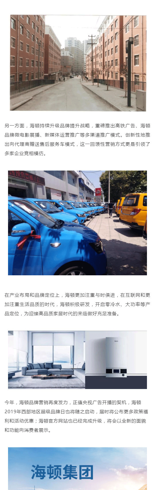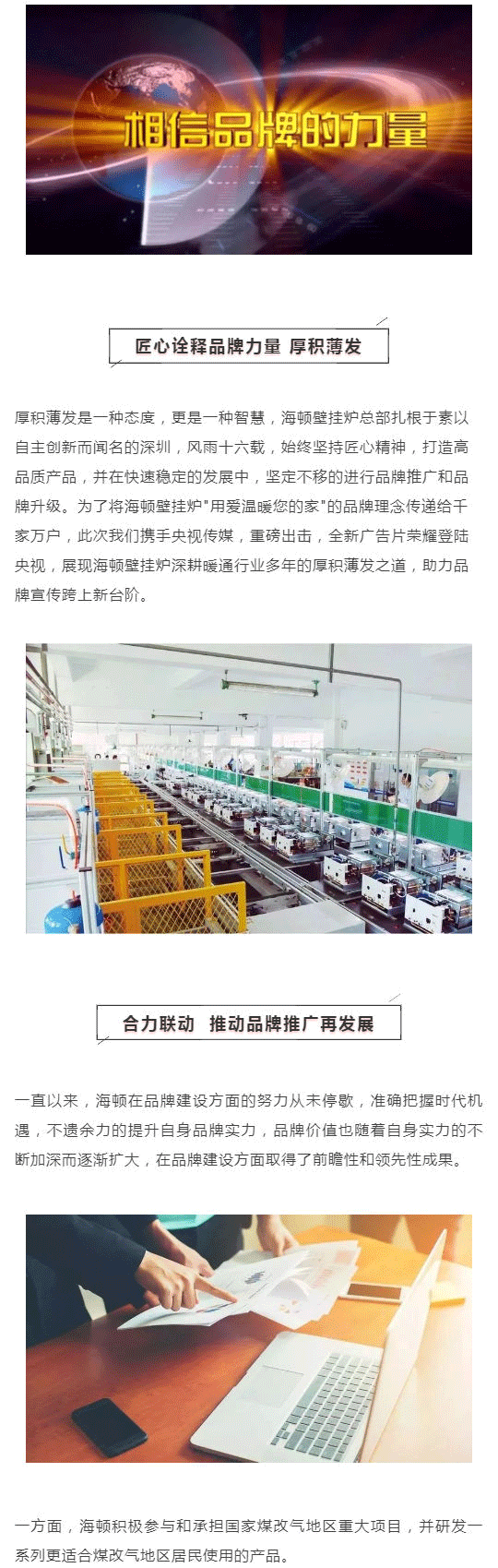 海頓自2003年成立以來,一直將自己定位為高端供暖設備引領者,為了實現這一目標海頓一直努力前行著。近年來暖通行業的迅猛發展,國家煤改氣政策大力推行,壁掛爐需求逐步擴大,為了充分把握暖通市場的發展機遇,海頓進一步遵循“用愛溫暖您的家”的發展戰略,一方面秉承專業制造精品的產品理念,持續加大科技投入,研發新品,另一方面全面提升品牌實力和影響力,聚勢贏銷,高鐵廣告、央視廣告全面開花,集中打造品牌核心競爭力,讓海頓走進更多消費群體家中。